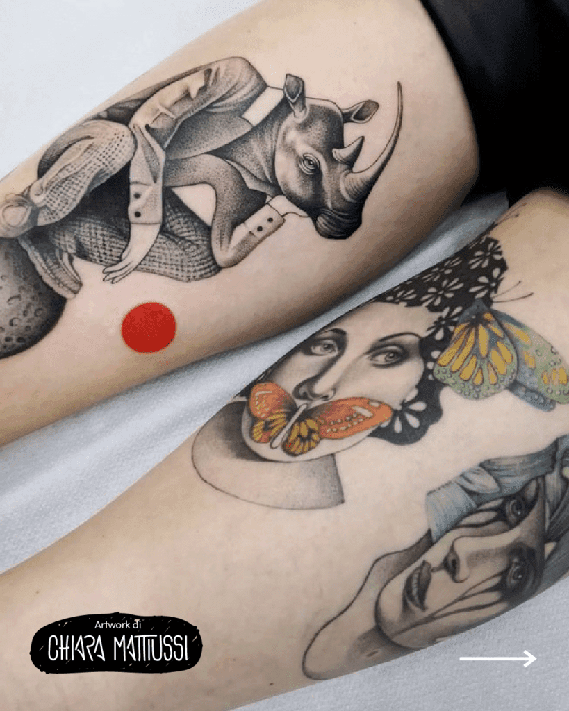 I soggetti dei tatuaggi surrealisti possono includere animali antropomorfi, oggetti inanimati che prendono vita e immagini di mondi alternativi e fantastici, in un modo in cui gli oggetti visibili si uniscono ad elementi dell’inconscio. Non c’è una norma da seguire rispetto all’uso di colori: possono essere vivaci e brillanti o può essere un tatuaggio black.