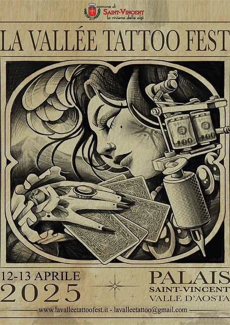 LaValleeTattooFest torna con la sua 3a edizione, un appuntamento unico per gli appassionati del mondo dei tatuaggi e delle arti performative! La locandina, realizzata dal tatuatore Fabio Fasulo e premiata la scorsa edizione, annuncia due giorni di pura creatività e spettacolo con oltre 90 tatuatori nazionali ed internazionali. Accompagna l'evento la speaker e presentatrice Barbara Morris.